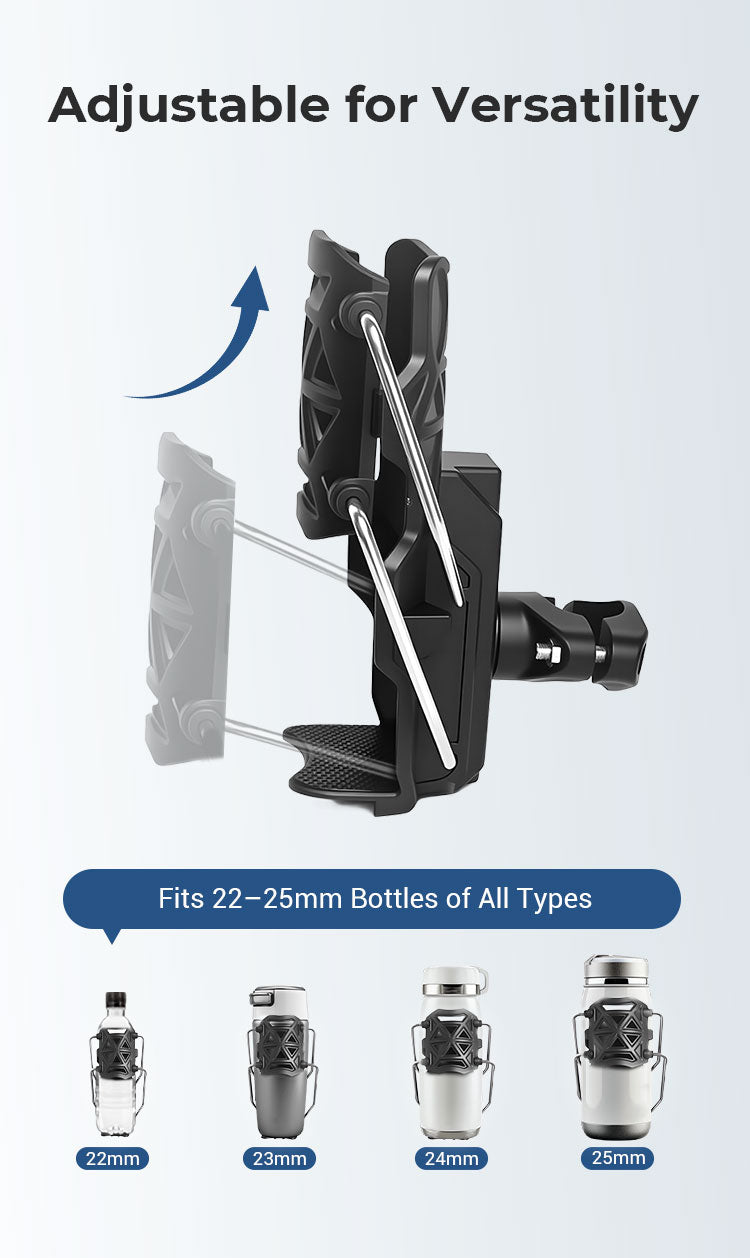 ADAPTIVE CUP SIZE FITTING: The bottle holder is engineered with a flexible lattice structure that automatically adjusts to various cup diameters, ensuring a secure grip for different water bottle sizes. This eliminates the need for multiple holders, simplifying storage and enhancing convenience for cyclists who frequently switch bottles during rides.