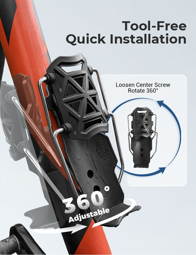 360-DEGREE ROTATION FUNCTIONALITY: Designed with a full rotational mechanism, the holder allows users to adjust the bottle orientation at any angle for optimal access. This feature is particularly useful in tight cycling spaces where positioning flexibility can prevent spills and improve hydration efficiency during motion.
