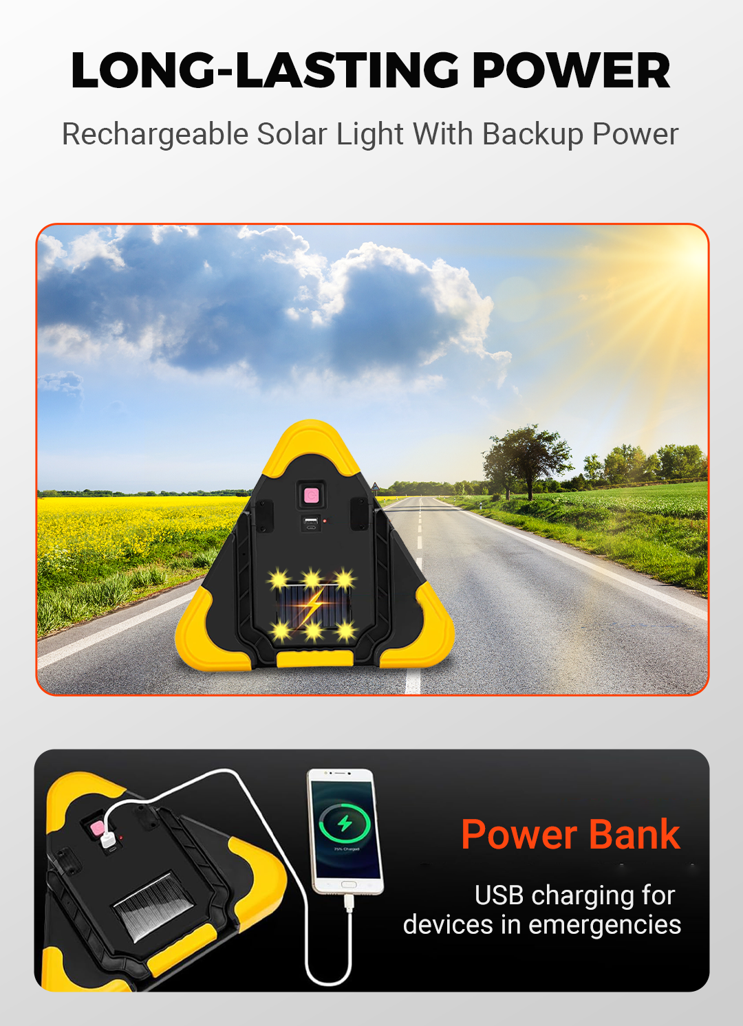 Better prepared than not at all! Your journeys are now even safer with this super bright triangular roadside emergency light. It features 3 COB LED lights with 4 light modes so you can warn other vehicles and ask for help. This warning light is great for hiking, camping trips, exploring and car repairs.