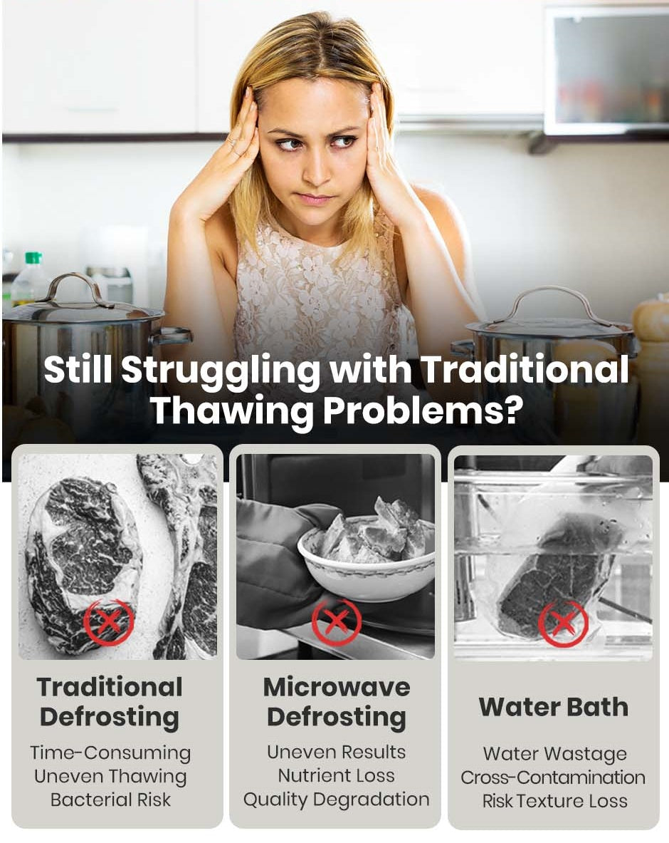 4 Major Problems of Traditional Thawing Methods: Long Defrosting Time, Bacterial Growth, Nutrient Loss, and Poor Taste.