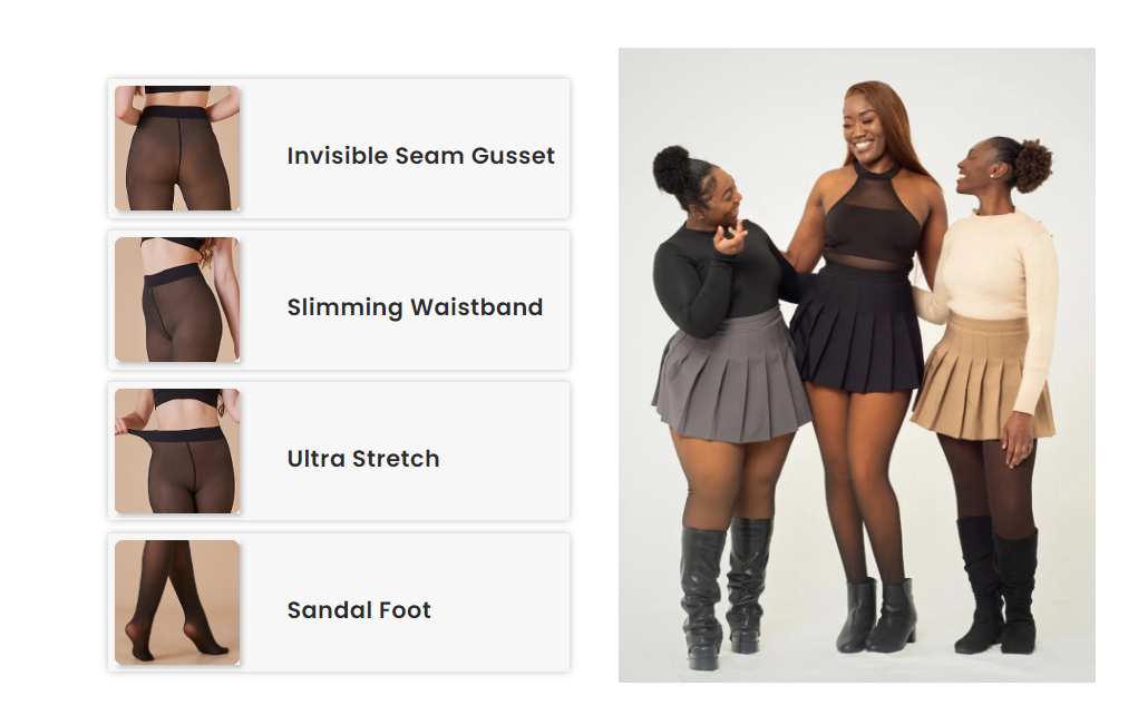 Our Flawless Legs Pantyhose is innovative. it's made of a super comfortable STRETCHY material that will allow you to move freely and that will immediately give the effect of slimmer slim curves and slender legs. Perfect for every body type, from petite to curvy.