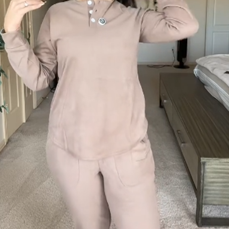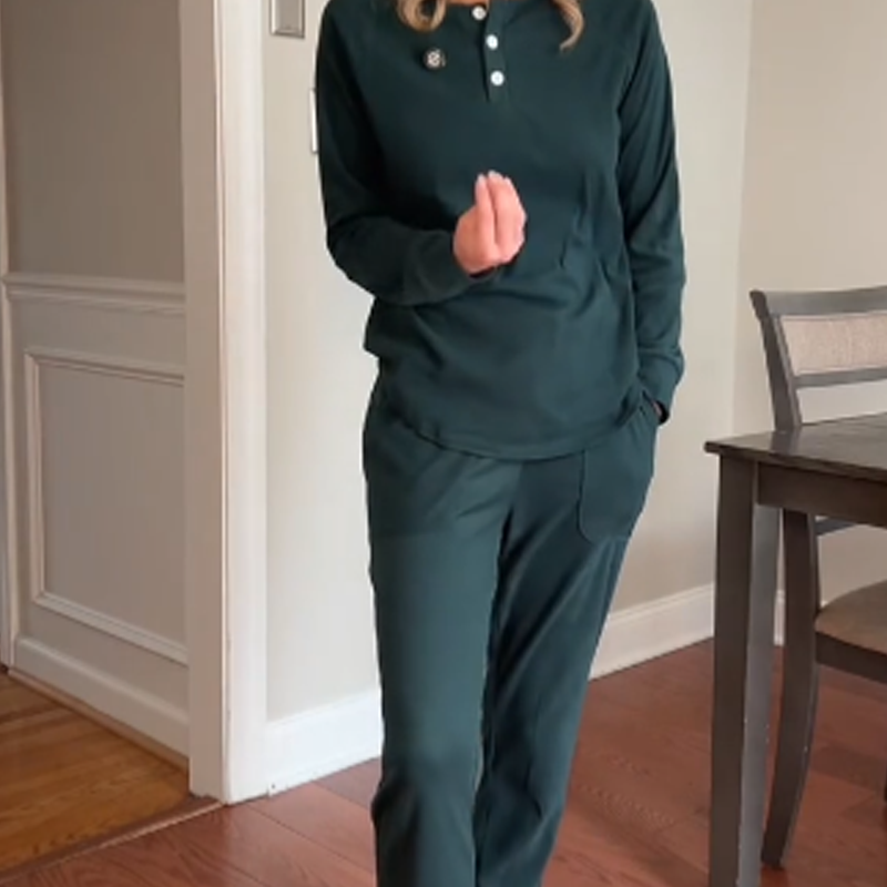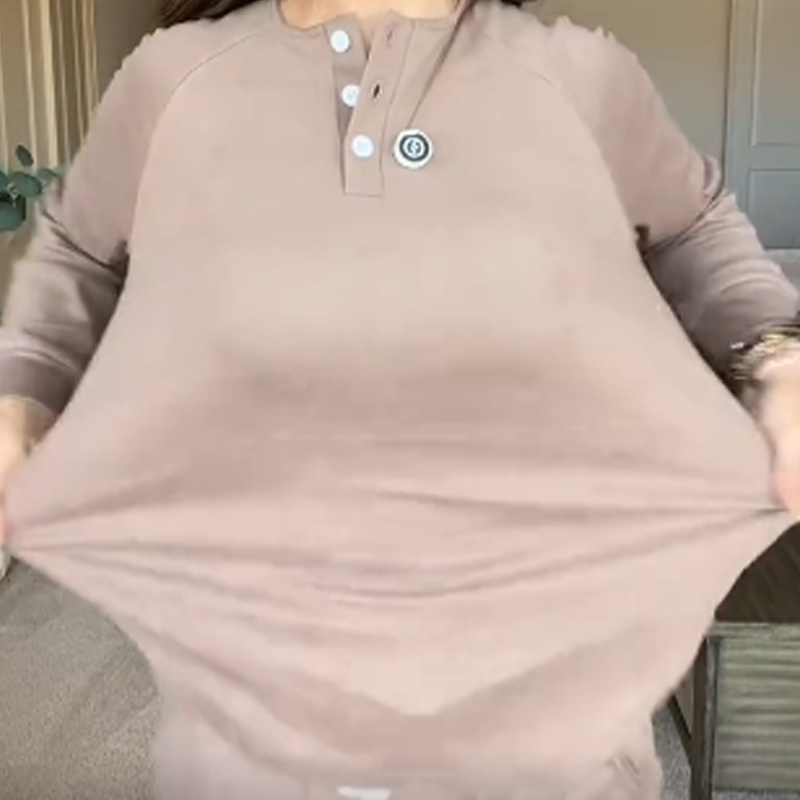 BUTTONED PULLOVER TOP – This long-sleeve pullover top offers both comfort and practicality. The partial button detail at the neckline allows easy on-and-off wear and adjustable coverage. Smooth, soft fabric drapes naturally for a flattering fit, making it suitable for layering or wearing on its own. Its versatile style works well for casual home lounging or light outdoor activities, providing effortless daily comfort.