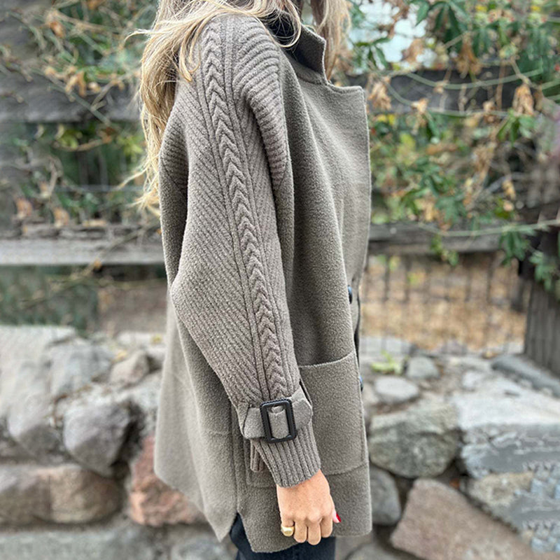 PRACTICAL POCKETS – Vertical pockets are placed on both sides of the coat, offering easy access for storing essentials like keys, phone, or wallet. Their discreet integration maintains the streamlined appearance of the garment while ensuring daily convenience. Positioned for comfort, these pockets allow natural hand placement without interrupting the coat’s elegant lines.