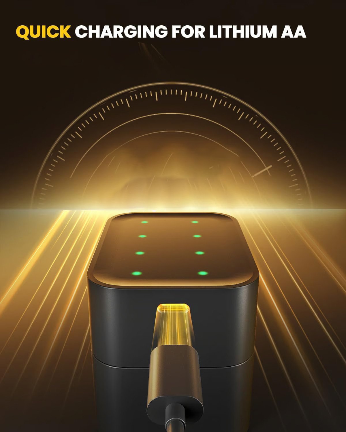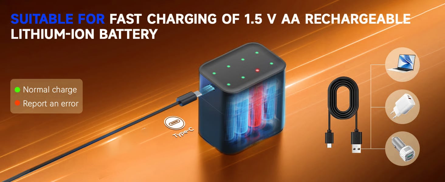 【Smart LED Display】The LED light displays charging status. Flashing Green indicates charging, Static Green indicated fully charged, Red indicates error battery or temperature state. For rechargerable 1.5V AA/AAA Lithium battery can in 4 hours in Static Green fully charged state.