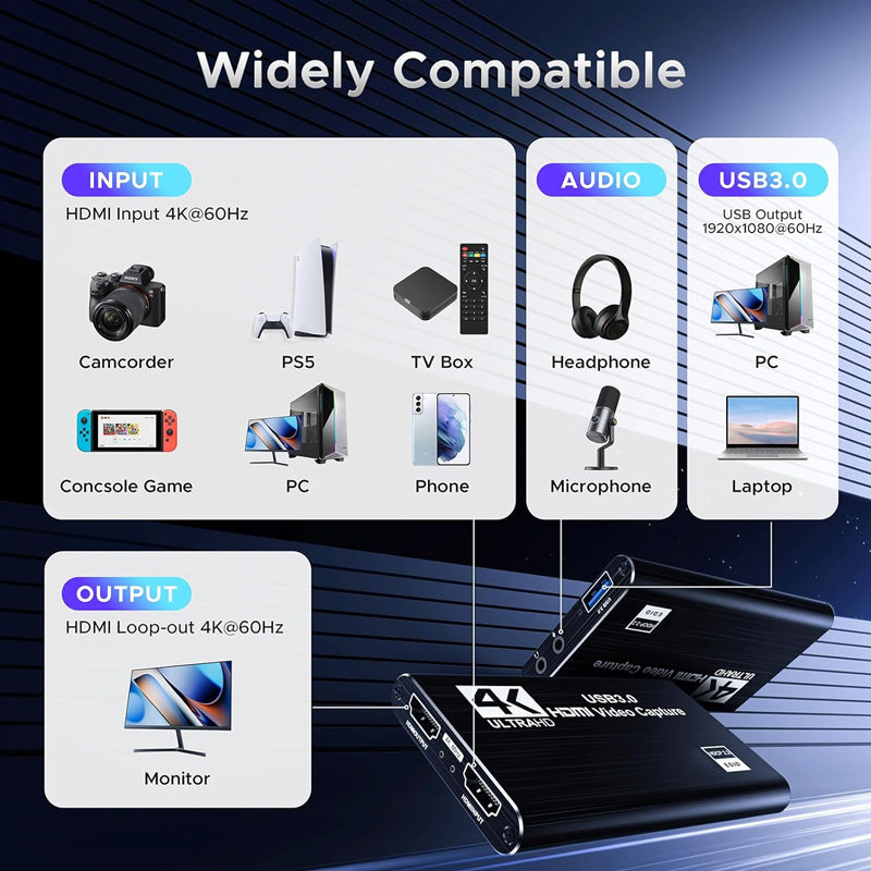HIGH-DEFINITION VIDEO CAPTURE – Capture stunning video quality with support for up to 1080P at 60Hz recording and 4K at 60Hz HDMI input. The advanced loop-out function ensures smooth, real-time monitoring, making it perfect for live streaming, gaming, and professional video production.