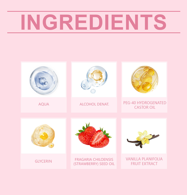 Key Ingredients: Water, Glycerin, Strawberry Seed Oil, PEG-40 Hydrogenated Castor Oil, Vanilla Extract