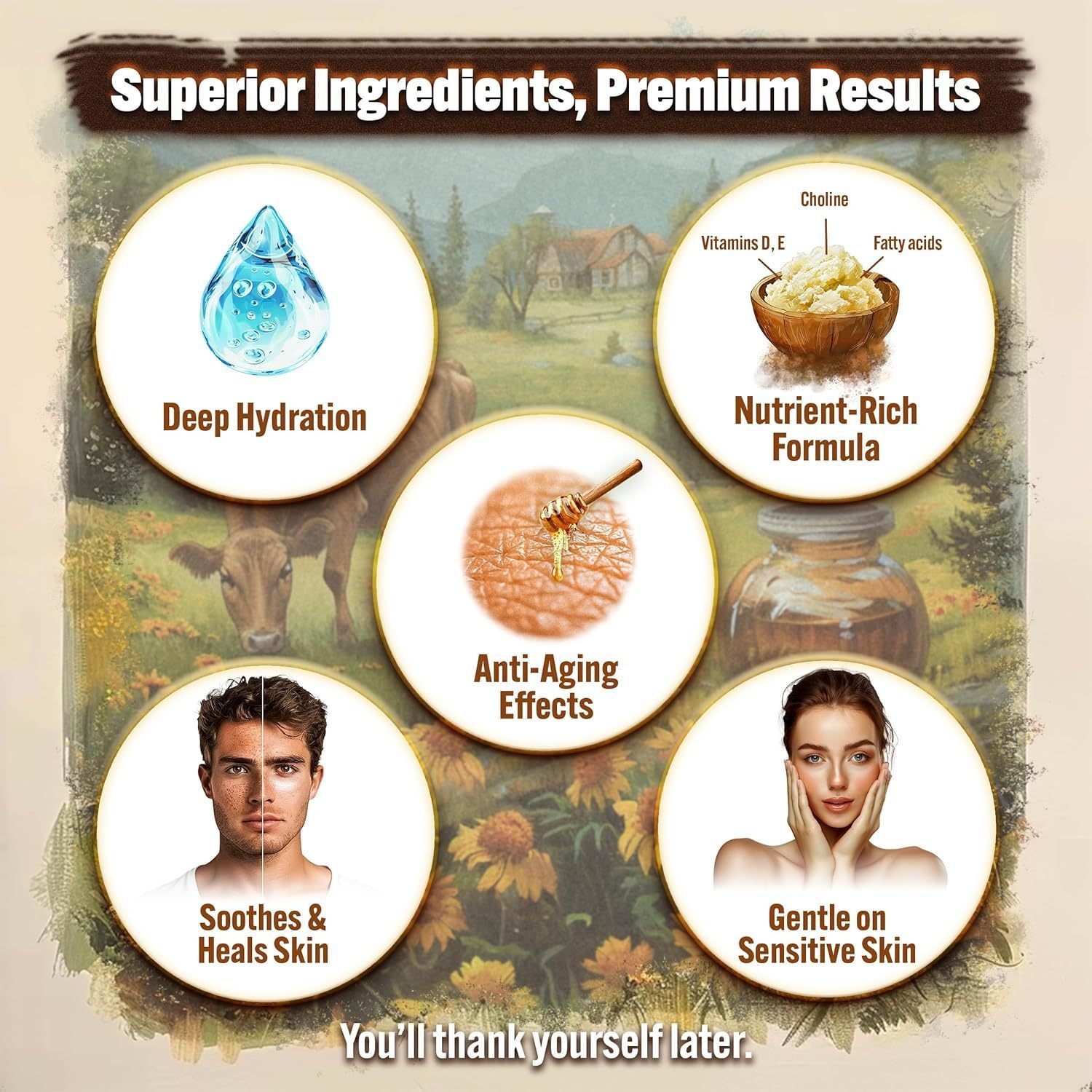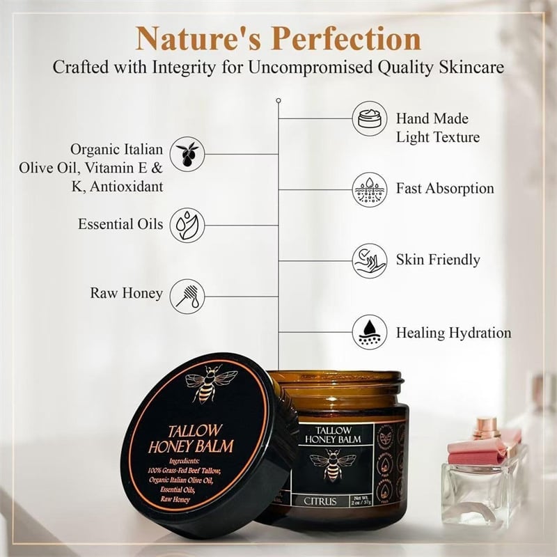 1.100% Grass-Fed Beef Tallow: Rich in vitamins A, D, E, and K, beef tallow provides intense hydration and promotes skin elasticity. Its composition closely resembles human skin's natural oils, making it highly effective in restoring and maintaining a healthy skin barrier.
