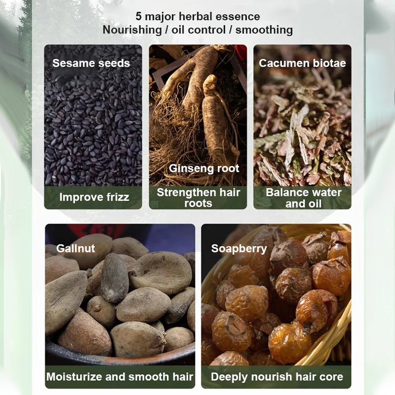 Herbal Essences: Sesame seeds, Ginseng root, Cacumen biotae, Gallnut, Soapberry