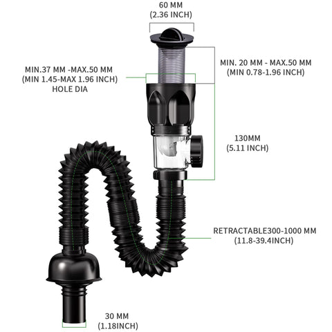 The drain pipe kit is designed with an anti-clogging sink stopper, which can collect hairs and fines, and prevents the drain from clogging up.