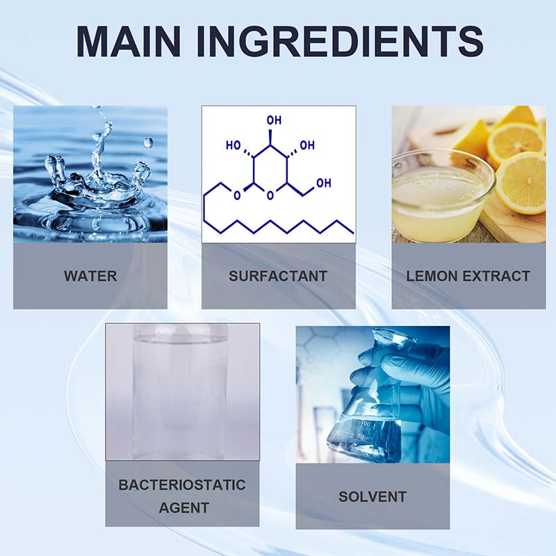 Main ingredients: water, surfactant, lemon extract, solvent, bacteriostatic agent