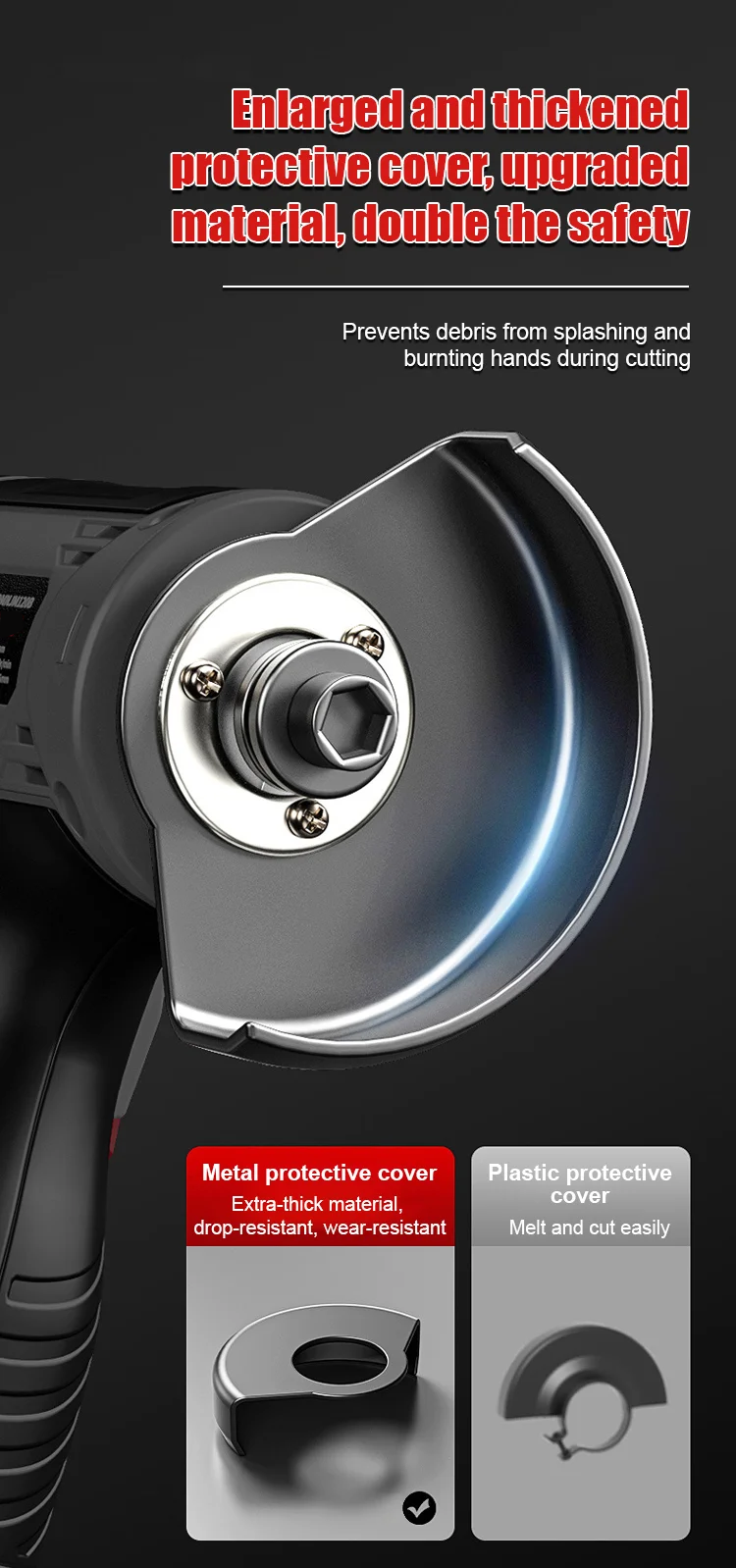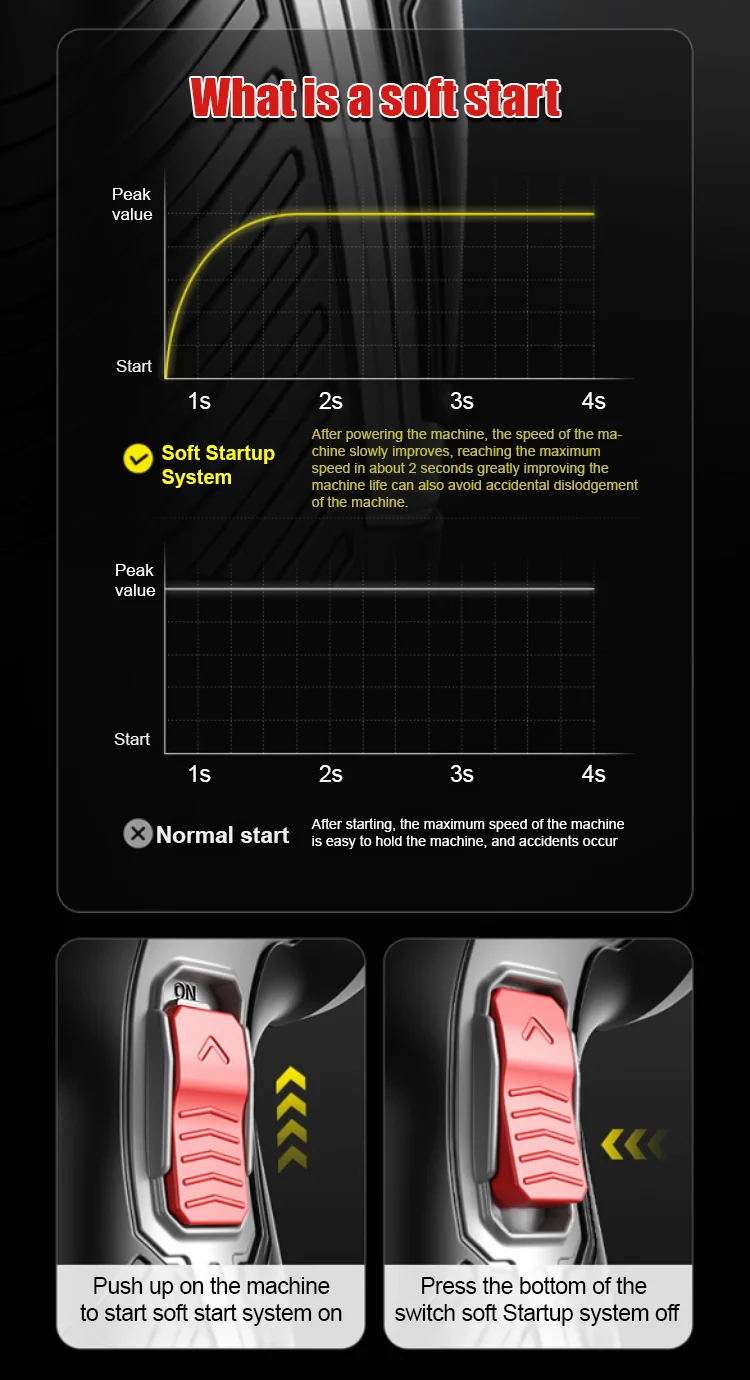 CONTROL WITH SOFT-START SYSTEM – The grinder features -engineered soft-start system that gradually ramps up to full speed in just 2 seconds, ensuring safer operation and reducing the risk of sudden jolts. This technology enhances user control, making it ideal for both professionals and DIY enthusiasts.