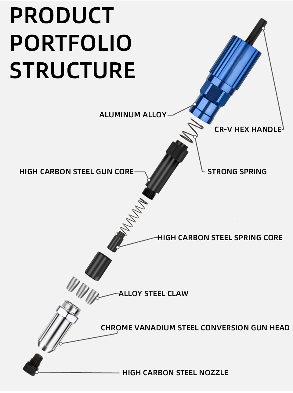PORTABLE WRENCH-----Equipped 4 changeable nozzle bolts for replacing the attaching assembly part. It matches the rivet gun and bolts well, making assembly process a breeze.