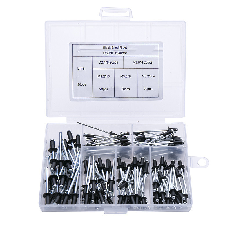 120PCS RIVETS-----Containing 6 different sizes blind rivets (aluminum rivet head and alloy steel rivet core): ①M2.4*6mm, ②M3.0*6mm, ③M3.2*6.4mm, ④M3.2*8mm, ⑤M3.2*10mm, ⑥M4*8mm. This product has everything you need to get the riveting job done.