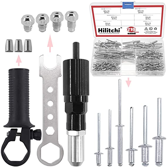 Cordless Drill Electric Rivet Gun Adapter-Professional Riveting Insert Nut Hand Tool Kit with Aluminum Casting Housing and a Non-slip Handle-4pcs Convertible Head and a Wrench.Our Rivet Gun metal Adapter have lower noise, more efficient,small size and easy to carry,universal drill attachment to easily apply nut rivet Inserts to various materials.