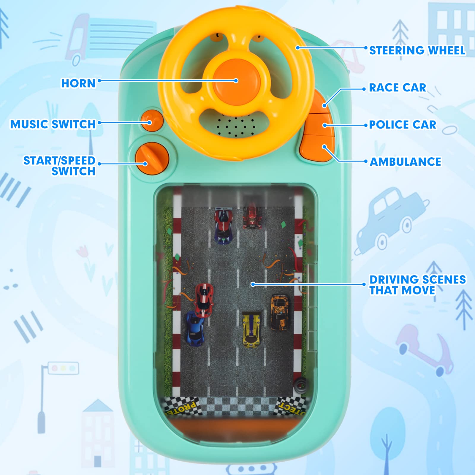 The fantastic toy wheel comes with left and right , music, horn, sounds of different vehicle to simulate driving.