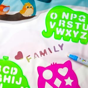 The drawing mat is printed with alphabet letters in eye-catching animal shapes, colorful shapes,number templates and geometric patterns tools. Eventually, it allows kids to learn to write the alphabet through drawing and playing.